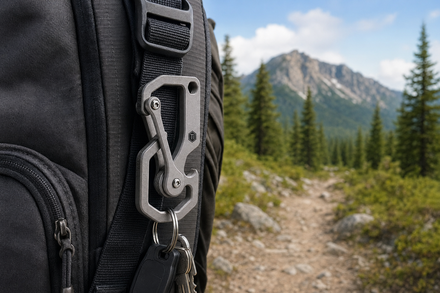 Lightweight Grade 5 titanium carabiner keychain with quick-release mechanism and bottle opener.