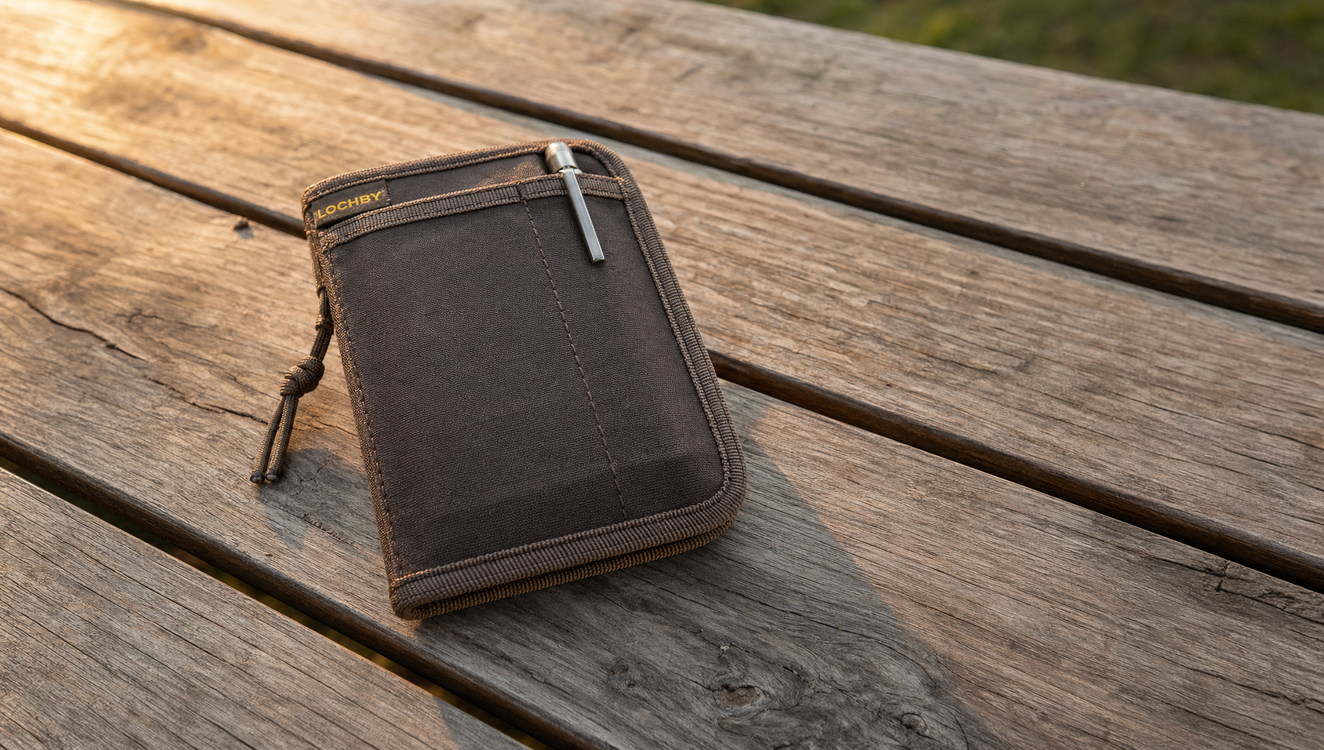 Premium waxed canvas pocket journal with Tomoe River paper, YKK zipper, and water-resistant construction for everyday carry.
