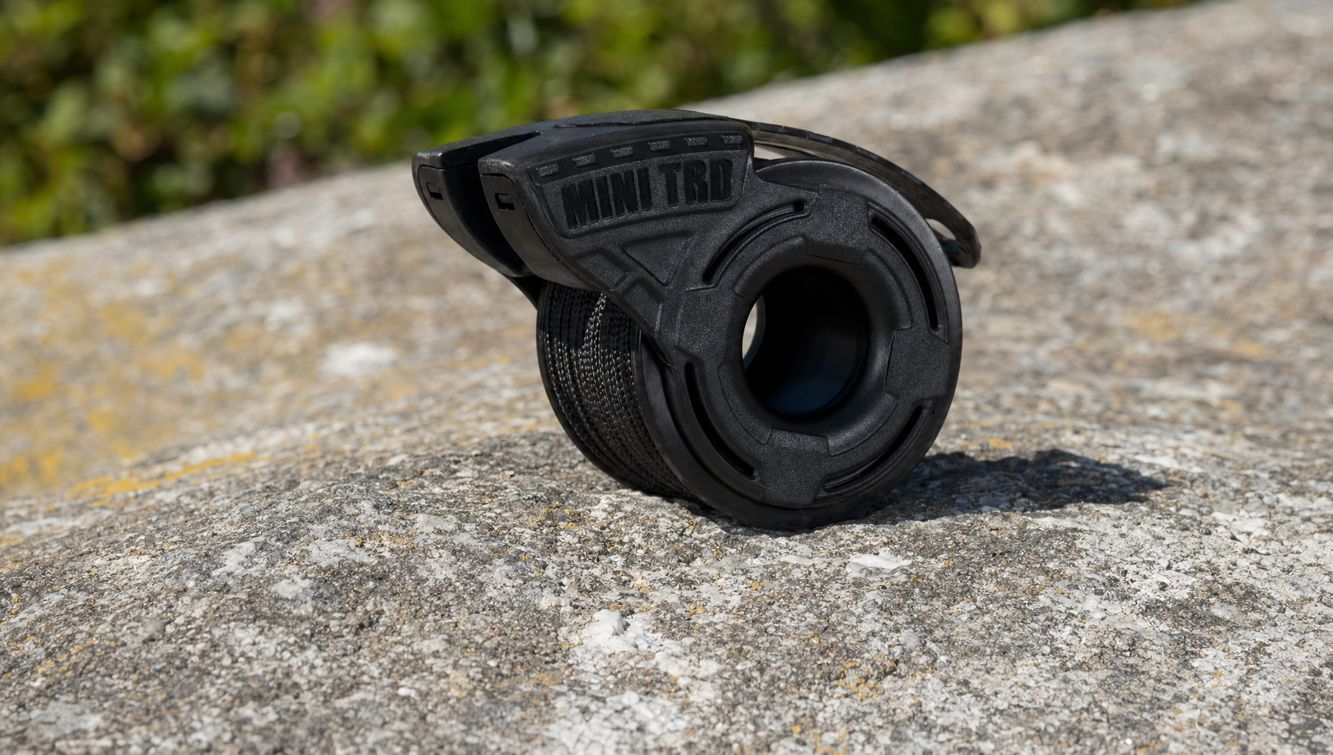 Compact 125ft micro cord dispenser in black with built-in cutter for EDC and survival kits.