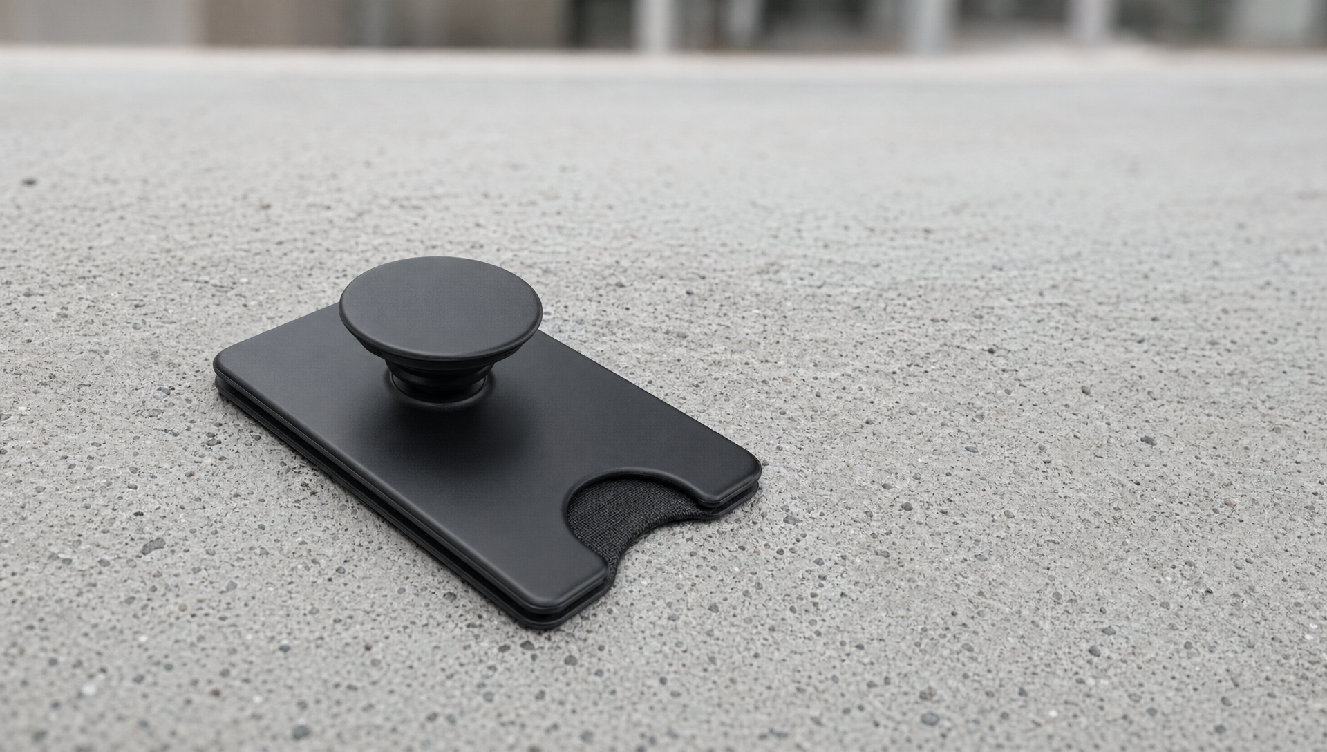 Snap-on phone wallet with PopGrip that holds up to 3 cards and offers secure adhesive attachment.